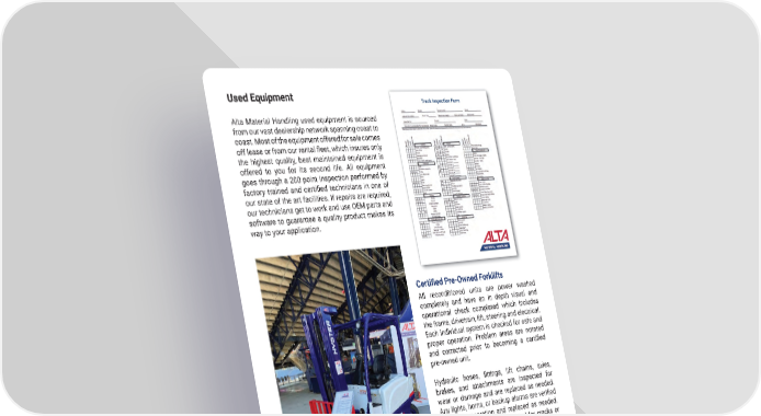 Used Equipment Truck Inspection Form Alta Material Handling used equipment is sourced from our vast dealership network spanning coast to coast� Most of the equipment offered for sale comes off lease or from our rental 昀氀eet, which insures only the highest quality, best maintained equipment is offered to you for its second life� All equipment goes through a 200 point inspection performed by factory trained and certi昀椀ed technicians in one of our state of the art facilities� If repairs are required, our technicians get to work and use OEM parts and software to guarantee a quality product makes its way to your application� Certi昀椀ed Pre-Owned Forklifts All reconditioned units are power washed completely and have an in depth visual and operational check completed which includes the frame, drivetrain, lift, steering and electrical� Each individual system is checked for safe and proper operation� Problem areas are notated and corrected prior to becoming a certi昀椀ed pre-owned unit� Hydraulic hoses, 昀椀ttings, lift chains, axles, brakes, and attachments are inspected for wear or damage and are replaced as needed� Any lights, horns, or backup alarms are veri昀椀ed for proper operation and replaced as needed� Frames and welds are inspected for cracks or misalignment. All 昀氀uids are changed, and the unit is checked for leaks� Engine compression is checked for proper readings per OEM Service Manual and any issues with the engine are addressed as needed (LP units only)� Tires and seats are replaced with new parts and each unit receives a full paint job� All parts used are Hyster or Yale OEM parts installed by factory trained and certi昀椀ed technicians. mh.altg.com 68