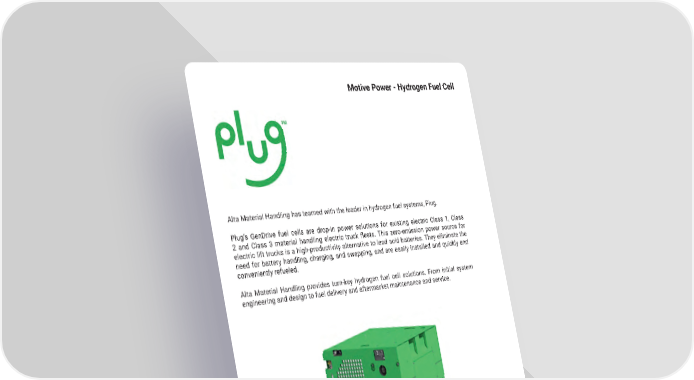 Motive Power - Hydrogen Fuel Cell Alta Material Handling has teamed with the leader in hydrogen fuel systems, Plug� Plug’s GenDrive fuel cells are drop-in power solutions for existing electric Class 1, Class 2 and Class 3 material handling electric truck 昀氀eets. This zero-emission power source for electric lift trucks is a high-productivity alternative to lead acid batteries� They eliminate the need for battery handling, charging, and swapping, and are easily installed and quickly and conveniently refueled� Alta Material Handling provides turn-key hydrogen fuel cell solutions� From initial system engineering and design to fuel delivery and aftermarket maintenance and service� mh�altg�com 65