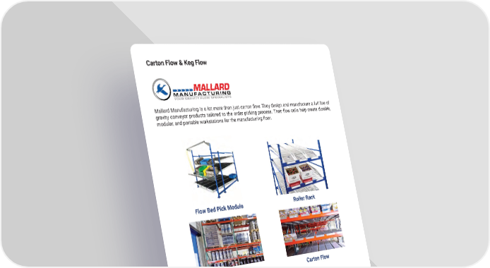 Carton Flow & Keg Flow Mallard Manufacturing is a lot more than just carton 昀氀ow. They design and manufacture a full line of gravity conveyor products tailored to the order picking process. Their 昀氀ow cells help create durable, modular, and portable workstations for the manufacturing 昀氀oor. Flow Bed Pick Module Roller Rack Keg Flow Rack Carton Flow Flow Bed mh.altg.com 16