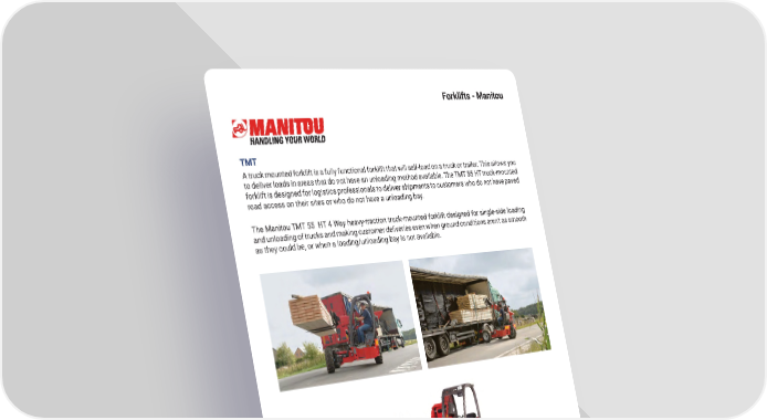 Forklifts - Manitou TMT A truck mounted forklift is a fully functional forklift that will self-load on a truck or trailer� This allows you to deliver loads in areas that do not have an unloading method available� The TMT 55 HT truck-mounted forklift is designed for logistics professionals to deliver shipments to customers who do not have paved road access on their sites or who do not have a unloading bay� The Manitou TMT 55 HT 4 Way heavy-traction truck-mounted forklift designed for single-side loading and unloading of trucks and making customer deliveries even when ground conditions aren’t as smooth as they could be, or when a loading/unloading bay is not available� mh�altg�com 51