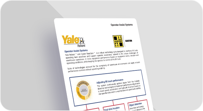 Operator Assist Systems Operator Assist Systems Yale Reliant ™ and Hyster Reaction ™ is a robust technology suite designed to reinforce lift truck operating best practices and support operator awareness, tailored to the unique challenges of warehouse operations� It limits equipment performance based on equipment status, location and operating conditions, while keeping the operator in control of the lift truck� Suite of technologies account for the complexity of warehouse environments and apply smooth performance controls without upsetting stability� Adjusting lift truck performance The system continuously gathers inputs from the multiple detection technologies to implement performance adjustments to travel speed, acceleration and hydraulic functions based on site-speci昀椀c rules and in a way that does not upset truck stability. Proximity detection Real-time location Object detection Uses ultra-wideband tags sensing (RTLS) Uses lidar technology connected to equipment, Uses the same ultra-wide to detect objects in the personnel and facility band network as proximity path of travel – even if infrastructure to provide tags and adds beacons the obstruction is not real-time proximity setup throughout the facility connected to the tag-to- detection that triggers to determine real-time tag mesh network, such as operator alerts and location within sub-meter pedestrians or equipment proactive performance accuracy and enable without Yale Reliant adjustments, such as location-based rules like technology, or debris like speed reduction to equipment exclusion zones a stray box or pallet� maintain proper following and end-of-aisle slowdown� distance behind equipment or help safely navigate around pedestrians� mh�altg�com 13