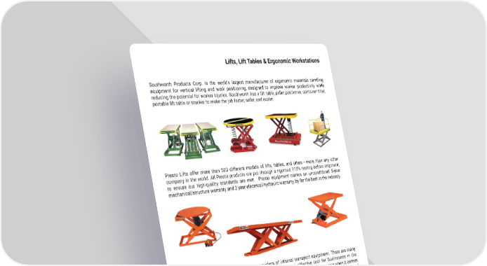 Lifts, Lift Tables & Ergonomic Workstations Southworth Products Corp� is the world’s largest manufacturer of ergonomic materials handling equipment for vertical lifting and work positioning, designed to improve worker productivity while reducing the potential for worker injuries� Southworth has a lift table, pallet positioner, container tilter, portable lift table or stacker to make the job faster, safer, and easier� Presto Lifts offer more than 500 different models of lifts, tables, and tilters - more than any other company in the world� All Presto products are put through a rigorous 110% testing before shipment, to ensure our high-quality standards are met� Presto equipment carries an unconditional 5-year mechanical/structure warranty and 2 year electrical/hydraulic warranty, by far the best in the Industry� Interthor is one of the world’s leading providers of internal transport equipment� There are many ways to improve your working environment, but the most effective tool for businesses in the material handling industry, is to look at workplace ergonomics� There is a lot to gain when it comes to workplace ergonomics - in terms of the health and wellbeing of your employees, and in terms of efficiency and performance� mh�altg�com 25