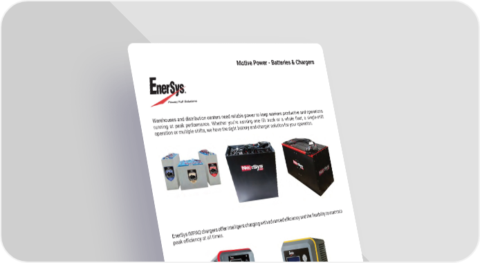 Motive Power - Batteries & Chargers Warehouses and distribution centers need reliable power to keep workers productive and operations running at peak performance. Whether you’re running one lift truck or a whole 昀氀eet, a single-shift operation or multiple shifts, we have the right battery and charger solution for your operation� EnerSys IMPAQ chargers offer intelligent charging with advanced e昀케ciency and the 昀氀exibility to maintain peak e昀케ciency at all times. mh�altg�com 63