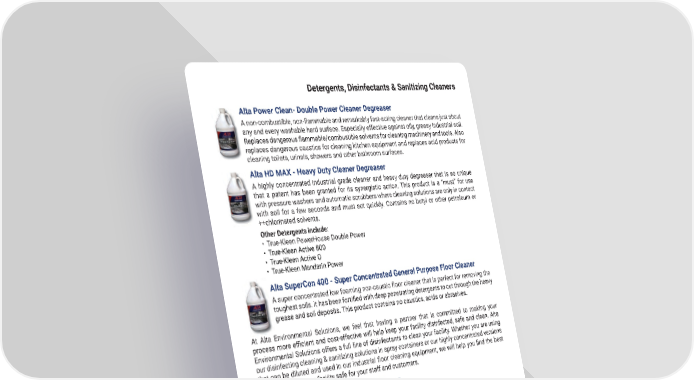 Detergents, Disinfectants & Sanitizing Cleaners Alta Power Clean- Double Power Cleaner Degreaser A non-combustible, non-昀氀ammable and remarkably fast-acting cleaner that cleans just about any and every washable hard surface� Especially effective against oily, greasy industrial soil� Replaces dangerous 昀氀ammable/combustible solvents for cleaning machinery and tools. Also replaces dangerous caustics for cleaning kitchen equipment and replaces acid products for cleaning toilets, urinals, showers and other bathroom surfaces� Alta HD MAX - Heavy Duty Cleaner Degreaser A highly concentrated industrial grade cleaner and heavy duty degreaser that is so unique that a patent has been granted for its synergistic action� This product is a “must” for use with pressure washers and automatic scrubbers where cleaning solutions are only in contact with soil for a few seconds and must act quickly� Contains no butyl or other petroleum or ++chlorinated solvents� Other Detergents include: • True-Kleen PowerHouse Double Power • True-Kleen Active 800 • True-Kleen Active O • True-Kleen Mandarin Power Alta SuperCon 400 - Super Concentrated General Purpose Floor Cleaner A super concentrated low foaming non-caustic 昀氀oor cleaner that is perfect for removing the toughest soils. It has been forti昀椀ed with deep penetrating detergents to cut through the heavy grease and soil deposits� This product contains no caustics, acids or abrasives� At Alta Environmental Solutions, we feel that having a partner that is committed to making your process more e昀케cient and cost-effective will help keep your facility disinfected, safe and clean. Alta Environmental Solutions offers a full line of disinfectants to clean your facility� Whether you are using our disinfecting cleaning & sanitizing solutions in spray containers or our highly concentrated versions that can be diluted and used in our industrial 昀氀oor cleaning equipment, we will help you 昀椀nd the best solution to keep your facility safe for your staff and customers� AirX Spray n’ Go Disinfectant Cleaner • Kills 99�9% of bacteria in 5 seconds • Kills micro-organisms on soft services • Cleans and disinfects hard non porous surface and much more��� AirX Rx-44ACE • Kills 99�9% of bacteria in 5 seconds • Kills micro-organisms on soft services • Cleans and disinfects hard non porous surfaces and much more��� True-Kleen KLEEN-64 Disinfectant Cleaner One step disinfectant cleaner that is effective against a broad spectrum of bacteria, is virucidal & fungicidal when used as directed� mh�altg�com 57