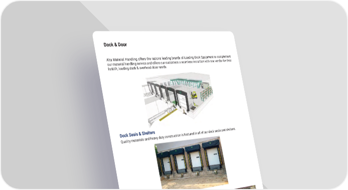 Dock & Door Alta Material Handling offers the nations leading brands of Loading Dock Equipment to complement our material handling service and offers our customers a seamless transition with one vendor for their forklift, loading dock & overhead door needs� Dock Seals & Shelters Quality materials and heavy duty construction is featured in all of our dock seals and shelters� Commercial Overhead Doors From state of the art high performance roll-up doors to sectional, TKO, and high speed doors, we provide solutions to accommodate all needs� Delivering a high-quality, cost-effective product is our standard and that is why Alta Material Handling has been chosen by many companies, small and large� mh.altg.com 28