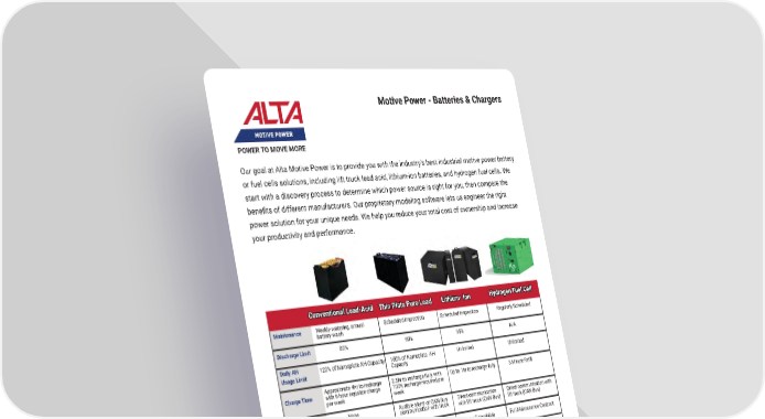 Motive Power - Batteries & Chargers POWER TO MOVE MORE Our goal at Alta Motive Power is to provide you with the industry’s best industrial motive power battery or fuel cells solutions, including lift truck lead acid, lithium-ion batteries, and hydrogen fuel cells� We start with a discovery process to determine which power source is right for you, then compare the bene昀椀ts of different manufacturers. Our proprietary modeling software lets us engineer the right power solution for your unique needs� We help you reduce your total cost of ownership and increase your productivity and performance� Conventional Lead-Acid ConvConveentional Lntional Lead-Acidead-Acid Thin PlateThin Plate Pur Pure Le Leeadad LLithium- Iithium- Ionon HHyydrdrogeogen Fn Fueuel Cel Cellll Maintenance Weekly watering, annual Scheduled Inspection Scheduled Inspection Regularly Scheduled battery wash Discharge Limit 80% 60% 95% N/A Daily AH 120% of Nameplate AH Capacity 160% of Nameplate AH Unlimited Unlimited Usage Limit Capacity Approximate 4hr to recharge 2�5hr to recharge fully with Charge Time with 6 hour equalize charge 100% recharge required per Up to 1hr to recharge fully 3 Minute Re昀椀ll per week week Over-Discharge None Audible alarm or CAN Bus Direct communication Direct communication with Protection communication with truck with lift truck (CAN Bus) lift truck (CAN Bus) Warranty 3 or 5 Year 5 year Extendable Full Maintenance Contract 5 Year Warranty Cycles 1500 Throughout Cycles 1540 Throughout Cycles 3000 Throughput Cycles N/A 5-10 YEAR 3-5 Year Average 5-10 YEAR Antcipated Life 4-5 Year Average Smart Battery Data Logger Data Logger BMS Computer and IOT Reporting Technology IOT Reporting Operator Proper watering, charging Proper charging and Proper charging Involvement and discharging discharging Proper fuel 昀椀lling Disadvantages High maintenance costs, Short life, limited High equipment cost High infrastructure, fuel, low productivity discharge capacity maintenance and equipment costs Fast recharge, low Long life, fast recharge, High productivity, low Bene昀椀ts Low equipment costs maintenance costs low maintenance costs, emissions, long life low electrical costs mh.altg.com 62