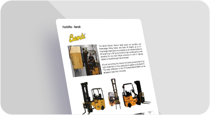 Forklifts - Bendi The Bendi Electric Narrow Aisle trucks are available with three-stage tilting masts and have lift heights up to 41’� Four-stage masts also are available on all 4-wheel models for lift heights up to 26’ giving the Bendi high stacking ability while allowing the low mast height necessary to work in highway trailers or travel through low doorways� Almost everything that makes the battery-powered Bendi the right choice for so many applications applies to the Bendi IC� The main difference is the LP-Powered Bendi B40i4 can be refueled in less than 5 minutes� The Bendi B40AC-DR and the B50AC-DR deep reach forklift can stack pallets double deep from 8’ aisles� It has lift heights of 425” and a 3,000 lb� capacity in the second deep position� mh.altg.com 42