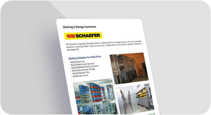 Shelving & Storage Containers SSI Schaefer integrated standard systems combine traditional storage products with semi-automated systems to develop e昀케cient solutions with short implementation times, minimal operation disruptions and faster ROI� Shelving Solutions for Small Parts • R3000®Shelving • R3000®Multi-Level Systems • R3000®Mobile Shelving Systems • R3000®Automotive Storage • R7000®Gravity Flow • KDR®Carton Flow Storage Container Solutions • Straight Wall Containers • Stack & Nest Containers • Automatic Systems Containers • Storage Bins mh.altg.com 24