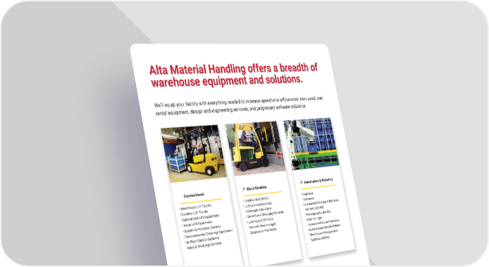 Alta Material Handling offers a breadth of warehouse equipment and solutions. We’ll equip your facility with everything needed to increase operational e昀케ciencies: new, used, and rental equipment, design and engineering services, and proprietary software solutions� Conventional Electri昀椀cation Automation & Robotics • Warehouse Lift Trucks • Lead Acid Batteries • Conveyor • Outdoor Lift Trucks • Lithium-Ion Batteries • Sortation • Specialized Lift Equipment • Hydrogen Fuel Cells • Automated Storage & Retrieval • Aerial Lift Equipment • Solid State Charging Systems System (AS/RS) • Burden & Personal Carriers • Low Speed Vehicles • Packaging & Labeling • E nvironmental Cleaning Equipment • R emote Monitoring & • Pick-To-Light • In-Plant Safety Systems Diagnostic Platforms • Automated Guided Vehicles • Rack & Shelving Systems • Autonomous Mobile Robots • Warehouse Management Software (WMS) mh�altg�com 5