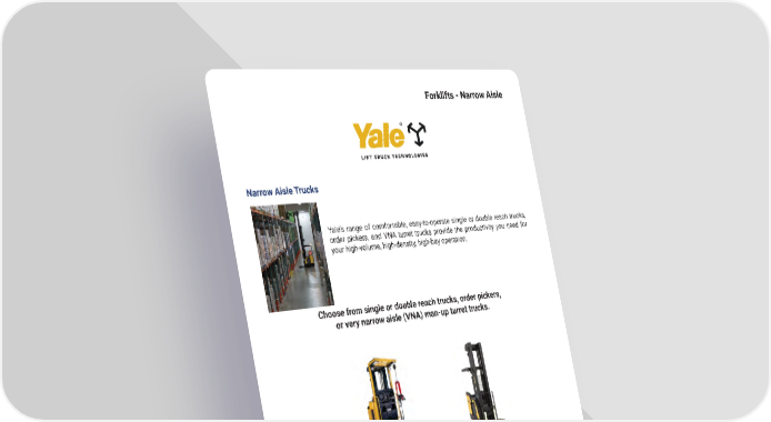 Forklifts - Narrow Aisle Narrow Aisle Trucks Yale’s range of comfortable, easy-to-operate single or double reach trucks, order pickers, and VNA turret trucks provide the productivity you need for your high-volume, high-density, high-bay operation� Choose from single or double reach trucks, order pickers, or very narrow aisle (VNA) man-up turret trucks. mh�altg�com 37