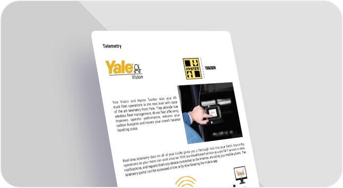 Telemetry Yale Vision and Hyster Tracker take your lift truck 昀氀eet operations to the next level with state of the art telemetry from Yale. They provide true wireless 昀氀eet management, drives 昀氀eet e昀케ciency, improves operator performance, reduces your carbon footprint and lowers your overall material handling costs� Real-time telemetry data on all of your trucks gives you a thorough look into your 昀氀eet’s day-to-day operations so your team can work smarter� With our cloud-based service you get 24/7 access to data, noti昀椀cations, and reports from any device connected to the Internet, including your mobile phone. The telemetry portal can be accessed online or by downloading the mobile app� mh.altg.com 12