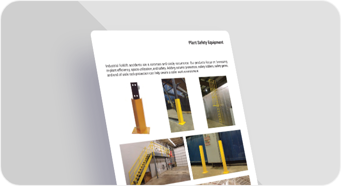 Plant Safety Equipment Industrial forklift accidents are a common and costly occurrence� Our products focus on increasing in-plant e昀케ciency, space utilization, and safety. Adding column protectors, safety ladders, safety gates, and end of aisle rack protection can help create a safer work environment� mh�altg�com 21