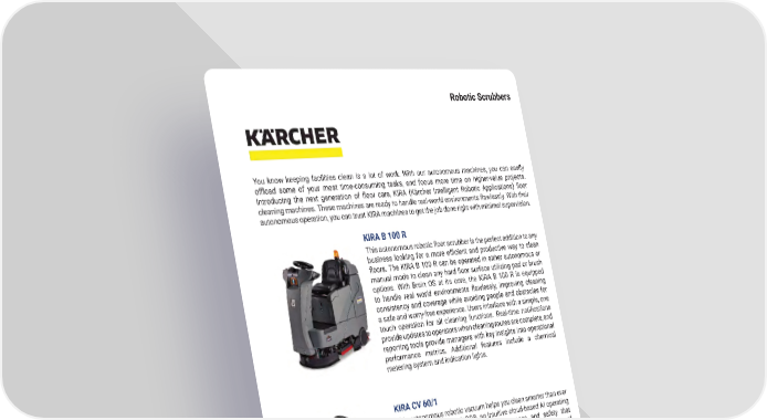 Robotic Scrubbers You know keeping facilities clean is a lot of work. With our autonomous machines, you can easily o昀툀oad some of your most time-consuming tasks, and focus more time on higher-value projects. Introducing the next generation of 昀氀oor care, KIRA (Kärcher Intelligent Robotic Applications) 昀氀oor cleaning machines. These machines are ready to handle real-world environments 昀氀awlessly. With their autonomous operation, you can trust KIRA machines to get the job done right with minimal supervision� KIRA B 100 R This autonomous robotic 昀氀oor scrubber is the perfect addition to any business looking for a more e昀케cient and productive way to clean 昀氀oors. The KIRA B 100 R can be operated in either autonomous or manual mode to clean any hard 昀氀oor surface utilizing pad or brush options� With Brain OS at its core, the KIRA B 100 R is equipped to handle real world environments 昀氀awlessly, improving cleaning consistency and coverage while avoiding people and obstacles for a safe and worry-free experience� Users interface with a simple, one touch operation for all cleaning functions. Real-time noti昀椀cations provide updates to operators when cleaning routes are complete, and reporting tools provide managers with key insights into operational performance metrics� Additional features include a chemical metering system and indication lights� KIRA CV 60/1 Bin Movement Solution This autonomous robotic vacuum helps you clean smarter than ever Take your assembly lines to the next levelbefore� Powered by BrainOS®, an intuitive cloud-based AI operating system, you get industry-leading performance and safety that by unlocking the bene昀椀ts of human-robotskillfully navigates around people and obstacles� Using an array of collaboration� While your employees canspecialized cameras and sensors, the CV 60/1 effortlessly adapts use their expertise to prepare kits inand learns user designated routes� The KIRA CV 60/1 is continuously stores, let our RM250 handle the learning and improving productivity, with real-time reporting available heavy-lifting by autonomously pickingvia your smartphone or tablet� It also provides the ability to switch and delivering them to wherever they’rebetween autonomy and standard manual operation� With optimal needed on the shop 昀氀oor on demand.health protection for users with the use of a HEPA rated vacuum bag and Lithium-ion battery for longer run time� mh�altg�com 11