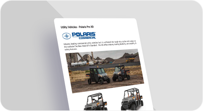 Utility Vehicles - Polaris Pro XD Industry leading commercial utility vehicles built to withstand the tough duty cycles and usage on the worksite-The New Work UTV Standard� Pro-XD offers industry leading durability, serviceability, & safety features� mh.altg.com 80