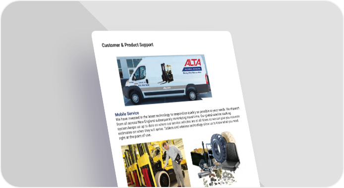 Customer & Product Support Mobile Service We have invested in the latest technology to respond as quickly as possible to your needs� We dispatch from all across New England subsequently minimizing travel time� Our global satellite tracking system keeps us up to date on where our service vehicles are at all times so we can give you accurate estimates on when they will arrive� Tablets and wireless technology allow us to know what you need right at the point of use� Tires Parts & Accessories The seasoned staff of Alta’s Tire Group are The only source you’ll need for lift truck parts fully equipped to handle all your industrial with more than 4�8 MILLION replacement parts tires needs! We purchase direct from multiple and accessories for more than 90 material O�E� manufacturers, and supply custom tires, handling equipment brand names� Our parts specialty tires and wheels that will address and accessories program provides the same challenges you may have with application and commitment to quality� No matter what kind of performance� We offer professional mobile forklift equipment, Alta Material Handling has you industrial tire service second to none with covered by offering quality accessories and parts our 250-ton, self-contained, over the road for any material handling need� Let our parts workshops when you need critical service to professionals take the headache out of sourcing keep you up and running� Contact us for a your material handling equipment parts� We stand consultation to discuss tires for your material behind our replacement parts with one of the handling equipment� strongest warranties in the industry� mh.altg.com 90