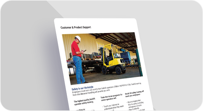 Customer & Product Support Safety is our Workstyle Employers must train and certify their forklift operators (OSHA 19CFR1910�178l)� Forklift training from Alta Material Handling will provide you with: The highest quality forklift Train-the-trainer programs for Aerial Lift safety training will operator safety training senior operators will: teach your employees: resulting in: • Teach your trainers to • How to inspect their • Increased productivity understand what they teach lifts for safety including • Reduced insurance premiums • How to teach emergency controls • Lower insurance costs • How to document everything • How to identify to ensure maximum workplace hazards that employee bene昀椀t and could cause injury adherence to OSHA • How to know fall and ANSI standards Our fully trained professional instructors have trained thousands of forklift operators and trainers on all types of lift trucks� We will put together a cost-effective training program tailored to your speci昀椀c lifts that will help your operators work safely and meet your compliance obligations either in person or online� mh.altg.com 92