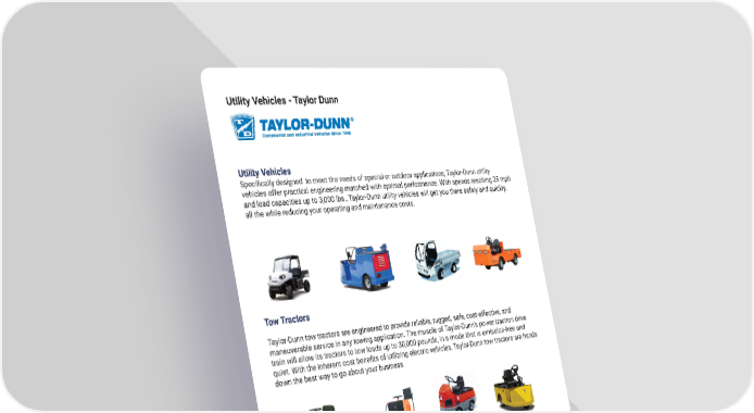 Utility Vehicles - Taylor Dunn Utility Vehicles Speci昀椀cally designed to meet the needs of special or outdoor applications, Taylor-Dunn utility vehicles offer practical engineering matched with optimal performance� With speeds reaching 25 mph and load capacities up to 3,000 lbs�, Taylor-Dunn utility vehicles will get you there safely and quickly, all the while reducing your operating and maintenance costs� Tow Tractors Taylor-Dunn tow tractors are engineered to provide reliable, rugged, safe, cost-effective, and maneuverable service in any towing application� The muscle of Taylor-Dunn’s power traction drive train will allow its tractors to tow loads up to 30,000 pounds, in a mode that is emission-free and quiet. With the inherent cost bene昀椀ts of utilizing electric vehicles, Taylor-Dunn tow tractors are hands down the best way to go about your business� Tiger Manufacturing Corporation, a Taylor-Dunn owned company, is a leading worldwide provider of tow tractors, cargo tractors, aircraft tractors, and specialty vehicles for the aviation, industrial, commercial, military, and government markets� mh.altg.com 78
