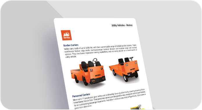 Utility Vehicles - Motrec Burden Carriers Safely carry loads of up to 5,000 lbs. with their customizable range of 昀氀atbed burden carriers. These workhorses feature large decks, multi-passenger modular designs and multiple cargo and seating options� They also boast impressive towing capabilities, and can easily double as a maintenance or utility vehicle� Personnel Carriers Move up to 11 people plus gear, safely and comfortably� Save valuable time by covering distances three times faster than on foot� Their personnel carriers are designed for easy navigation and smooth braking for an outstanding passenger experience. Available in various sizes and con昀椀gurations. Also makes a great tram alternative� mh�altg�com 77