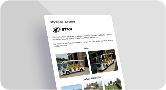 Utility Vehicles - Star Electric Star electric vehicles are the best valued electric vehicles on the market� Star EV offers a variety of models from passenger buses to 昀氀atbed utility vehicles, all electric driven. Star electric vehicles have quickly become a popular and major brand in the industry since its introduction in 2004� Buses Low Speed Vehicles (LSV) mh.altg.com 76