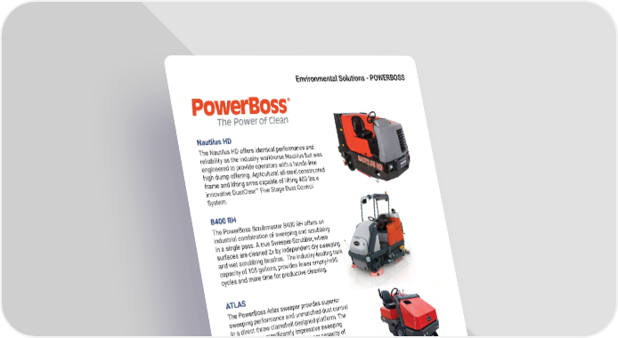 Environmental Solutions - POWERBOSS Nautilus HD The Nautilus HD offers identical performance and reliability as the industry workhorse Nautilus but was engineered to provide operators with a hands-free high dump offering� Agricultural all-steel constructed frame and lifting arms capable of lifting 400 lbs�e innovative DustClear™ Five Stage Dust Control System� B400 RH The PowerBoss Scrubmaster B400 RH offers an industrial combination of sweeping and scrubbing in a single pass� A true Sweeper-Scrubber, where surfaces are cleaned 2x by independent dry sweeping and wet scrubbing brushes� The industry-leading tank capacity of 105 gallons, provides fewer empty/re昀椀ll cycles and more time for productive cleaning� ATLAS The PowerBoss Atlas sweeper provides superior sweeping performance and unmatched dust control in a direct throw clamshell designed platform� The Atlas offers a signi昀椀cantly impressive sweeping path ranging from 64-84” and hopper capacity of 16ft^3 and emptying weight capacity of 1,200 lbs� exhibitions, & convention centers� mh�altg�com 67