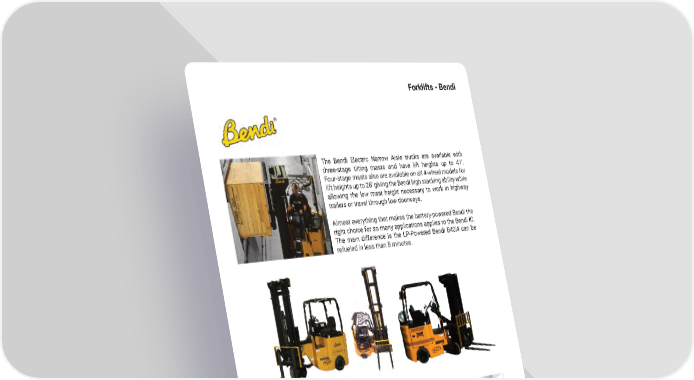Forklifts - Bendi The Bendi Electric Narrow Aisle trucks are available with three-stage tilting masts and have lift heights up to 41’� Four-stage masts also are available on all 4-wheel models for lift heights up to 26’ giving the Bendi high stacking ability while allowing the low mast height necessary to work in highway trailers or travel through low doorways� Almost everything that makes the battery-powered Bendi the right choice for so many applications applies to the Bendi IC� The main difference is the LP-Powered Bendi B40i4 can be refueled in less than 5 minutes� The Bendi B40AC-DR and the B50AC-DR deep reach forklift can stack pallets double deep from 8’ aisles� It has lift heights of 425” and a 3,000 lb� capacity in the second deep position� mh�altg�com 55