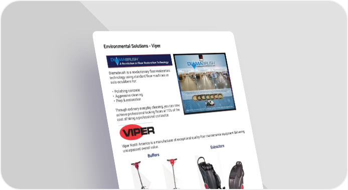 Environmental Solutions - Viper Diamabrush is a revolutionary 昀氀oor restoration technology using standard 昀氀oor machines or auto-scrubbers for: • Polishing concrete • Aggressive cleaning • Prep & restoration Through ordinary everyday cleaning, you can now achieve professional looking 昀氀oors at 10% of the cost of hiring a professional contractor� Viper North America is a manufacturer of exceptional quality 昀氀oor maintenance equipment delivering unsurpassed overall value� Buffers Extractors Vacs mh.altg.com 68