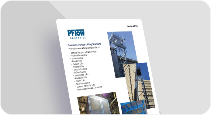 Vertical Lifts Complete Vertical Lifting Solutions PFlow is the world’s largest provider of: • Vertical Reciprocating Conveyors • Vertical Conveyors • Material Lifts • Freight Lifts • Custom Lifts • Vertical Lifts • Mezzanine Lifts • Sidewalk Lifts • Mechanical Lifts • Hydraulic Lifts • Goods Lifts • Continuous Lifts • Custom Industrial Lifts • Continuous Vertical Conveyors mh�altg�com 33
