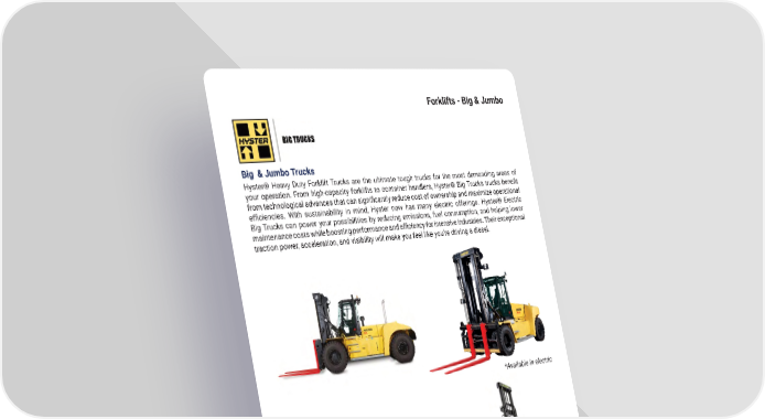 Forklifts - Big & Jumbo Big & Jumbo Trucks Hyster® Heavy Duty Forklift Trucks are the ultimate tough trucks for the most demanding areas of your operation. From high-capacity forklifts to container handlers, Hyster® Big Trucks trucks bene昀椀t from technological advances that can signi昀椀cantly reduce cost of ownership and maximize operational e昀케ciencies. With sustainability in mind, Hyster now has many electric offerings. Hyster® Electric Big Trucks can power your possibilities by reducing emissions, fuel consumption, and helping lower maintenance costs while boosting performance and e昀케ciency for intensive industries. Their exceptional traction power, acceleration, and visibility will make you feel like you’re driving a diesel� *Available in electric mh�altg�com 43