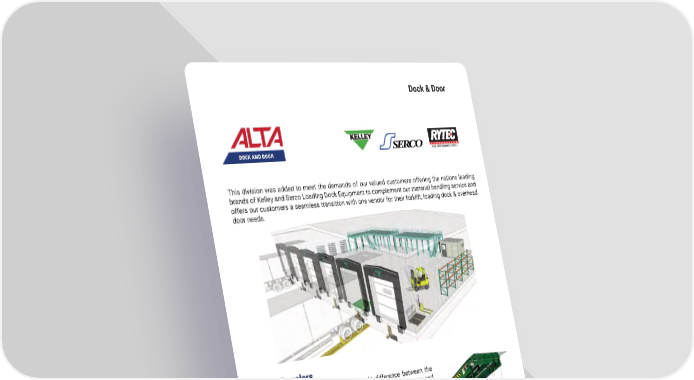 Dock & Door This division was added to meet the demands of our valued customers offering the nations leading brands of Kelley and Serco Loading Dock Equipment to complement our material handling service and offers our customers a seamless transition with one vendor for their forklift, loading dock & overhead door needs� Dock Levelers Dock levelers bridge the gap and height difference between the dock and the trailer� They also minimize product spills, wear and tear on equipment� and the strong vibrations which cause chronic back and neck injuries for forklift operators� A dock leveler includes a hinged ramp (hinged along its rear edge) and a lip (hinged at the front of the ramp)� We can help with: • Hydraulic Dock Levelers • Air Powered Dock Levelers • Mechanical Dock Levelers • Vertical Dock Levelers • Edge of Dock Levelers • Dock Bridges • Dock Lifts mh�altg�com 31