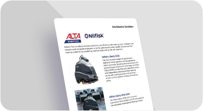 Alta Robotics Scrubbers Robotic 昀氀oor scrubbers increase productivity and e昀케ciency while reducing costs. Intelligent 昀氀oor cleaners work alongside employees, or can be used manually when needed. Autonomous 昀氀oor cleaning is ideal for accomplishing repetitive tasks side by side with operators� Nil昀椀sk’s Liberty SC50 This 昀氀oor scrubber bridges the gap between traditional human operation and next-generation robotic autonomy� By pairing advanced sensors with powerful image-interpretation technology, the Nil昀椀sk Liberty SC50 can map sites, plan operational routes, and independently execute your 昀氀oor-cleaning routine with unerring precision and accuracy – all with minimal operator training and maximum safety� Nil昀椀sk Liberty SC50 UGVI The Nil昀椀sk Liberty SC50 UGVI is the 昀椀rst autonomous 昀氀oor scrubber with UV technology for the single-pass cleaning & disinfecting of 昀氀oors. Bin Movement Solution Take your assembly lines to the next level by unlocking the bene昀椀ts of human-robot collaboration� While your employees can use their expertise to prepare kits in stores, let our RM250 handle the heavy-lifting by autonomously picking Liberty SC60 and delivering them to wherever they’re Built on Brain Corp’s powerful Brain OS – the world’s most widely-used autonomous operating system needed on the shop 昀氀oor on demand. – the high-performance Liberty SC60 also has the market’s largest autonomous ride-on, exemplary runtime, and minimal downtime requirements� mh�altg�com 11