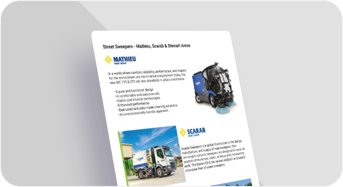 Street Sweepers - Mathieu, Scarab & Stewart Amos In a world where comfort, reliability, performance, and respect for the environment are the minimum requirement today, the new MC 110 & 210 set new standards in urban cleanliness� • A pure and functional design� • A comfortable and spacious cab� • Useful and intuitive technologies� • Enhanced performance� • Dedicated and tailor-made cleaning solutions� • An environmentally friendly approach� Scarab Sweepers is a global front-runner in the design, manufacture, and supply of road sweepers; their twin-engine vacuum sweepers are designed to cover all aspects of municipal, urban, or heavy-duty contracting work� The Maven 65 is the newest addition to Scarab’s innovative 昀氀eet of street sweepers. Stewart-Amos offers a full line of mechanical broom and regenerative air street sweepers, all based on one simple, time proven design� mh.altg.com 74