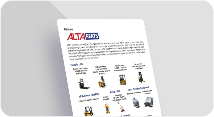 Rentals With locations throughout the Midwest and Northeast and over 15,000 pieces of late model, safe, & reliable equipment, Alta Rents is a true single source rental provider� With have over 87 years of combined experience we offer the best rental equipment and service at extremely competitive rates� We offer 2,000-120,000 lb capacity equipment utilizing electric, LPG, diesel, & gas power� We specialize in the hard to 昀椀nd equipment you need to keep your business working for you. Our rental staff is here to serve you with all your rental needs� Electric Lifts Electric Pallet Jacks Walkie Stackers Electric Riders Narrow Aisle 4,000 lb-8,000 lb 2,000 lb-4,000 lb 3,000 lb - 30,000 lb Order Selectors, Reach Walkie & Rider Straddle, Counter Balance Pneumatic & Cushion & Deep Reach & Reach LP & Diesel Forklifts Aerial Lifts Floor Cleaning Equipment Scissors Boom Lifts Walk Behind Scrubbers Ride On Sweeper LP/Diesel Pneumatic, Cushion 19’ to 42’ 30’ to 60’ Electric, Scrubbers Articulating & Straight Specialty Equipment Mariotti CombiLift Drexel /Bendi Motrec Carts 1,763 lb to 2,341 lb 6,000 lb to 10,000 lb Very Narrow Aisle Heavy Lifting Equipment Landoll Versa-lift Sellick Hyster PT40 25,000 lb- S Series Big Trucks 80,000 lb * Available brands vary by location. mh.altg.com 94