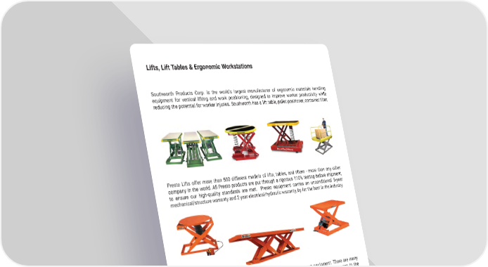28 mh�altg�com Lifts, Lift Tables & Ergonomic Workstations Presto Lifts offer more than 500 different models of lifts, tables, and tilters - more than any other company in the world � All Presto products are put through a rigorous 110% testing before shipment, to ensure our high-quality standards are met � Presto equipment carries an unconditional 5-year mechanical/structure warranty and 2 year electrical/hydraulic warranty, by far the best in the Industry � Southworth Products Corp � is the world’s largest manufacturer of ergonomic materials handling equipment for vertical lifting and work positioning, designed to improve worker productivity while reducing the potential for worker injuries � Southworth has a lift table, pallet positioner, container tilter, Interthor is one of the world’s leading providers of internal transport equipment � There are many ways to improve your working environment, but the most effective tool for businesses in the material handling industry, is to look at workplace ergonomics � There is a lot to gain when it comes to workplace ergonomics - in terms of the health and wellbeing of your employees, and in terms of
