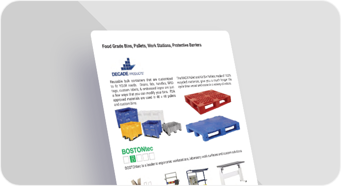 30 mh�altg�com Food Grade Bins, Pallets, Work Stations, Protective Barriers Reusable bulk containers that are customized to fit YOUR needs. Drains, lids, handles, RFID tags, custom labels, & embossed logos are just a few ways that you can modify your bins � FDA approved materials are used in 40 x 48 pallets and custom bins � The RACX Pallet and Kit Bin Pallets, made of 100% recycled materials, give you a much longer life cycle than wood and come in a variety of colors � BOSTONtec is a leader in ergonomic workstations, laboratory work surfaces and custom solutions � Keep employees safe with BOSTONtec protective barriers �