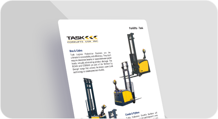 55 mh � altg � com Forklifts - Task Boa & Cobra Task Legless Pedestrian Stackers are the ultimate in accessibility and efficiency. They don’t require clearance beams or space between pallet loads, virtually eliminating product damage � The BOA® and COBRA® are part of the ‘Brilliant by Design’ range that utilizes the latest Laser Lock technology to create precision builds � Conda & Python Task’s Pedestrian Straddle Stackers will help make your storage and dispatch a very smooth process � Highly stable and very maneuverable, the CONDA® and PYTHON® have set new heights in materials handling � They come with the ‘Brilliant By Design’ lifetime chassis warranty �