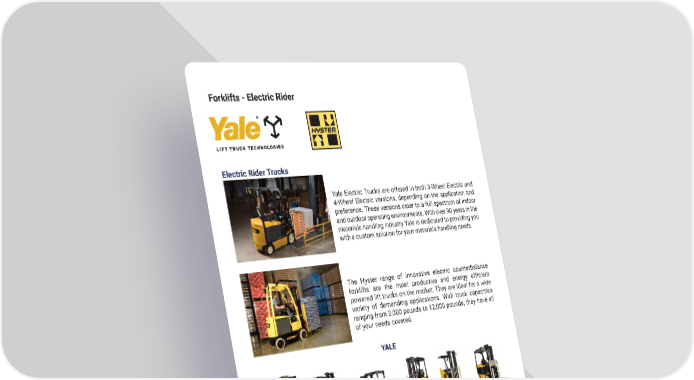 36 mh�altg�com Forklifts - Electric Rider Yale Electric Trucks are offered in both 3-Wheel Electric and 4-Wheel Electric versions, depending on the application and preference � These versions cater to a full spectrum of indoor and outdoor operating environments � With over 90 years in the materials handling industry Yale is dedicated to providing you with a custom solution for your materials handling needs � Electric Rider Trucks The Hyster range of innovative electric counterbalance forklifts are the most productive and energy efficient powered lift trucks on the market � They are ideal for a wide variety of demanding applications � With truck capacities ranging from 3,000 pounds to 12,000 pounds, they have all of your needs covered � YALE