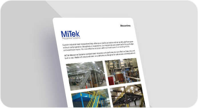 23 mh � altg � com Custom industrial steel mezzanines help utilize your warehouse space and can quickly add floor space without costly operation, disruptions, or expansions. Our mezzanines are customized to fit your budget and warehouse layout � Our cost-effective solutions add multi-level space to an existing facility � MiTek Mezzanine Systems standard steel industrial work platforms are cost effective, heavy duty and built to last � Made with structural steel, our platforms are designed for safe access and designed with Mezzanines