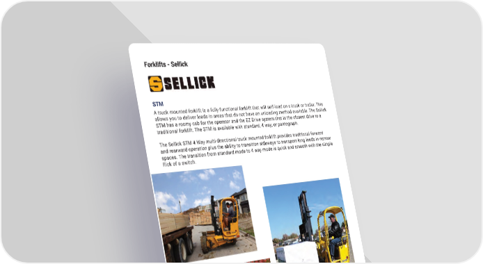 46 mh�altg�com STM A truck mounted forklift is a fully functional forklift that will self-load on a truck or trailer � This allows you to deliver loads in areas that do not have an unloading method available � The Sellick STM has a roomy cab for the operator and the EZ Drive system that is the closest drive to a traditional forklift � The STM is available with standard, 4 way, or pantograph � The Sellick STM 4 Way multi-directional truck mounted forklift provides traditional forward and rearward operation plus the ability to transition sideways to transport long loads in narrow spaces � The transition from standard mode to 4 way mode is quick and smooth with the simple flick of a switch � Forklifts - Sellick