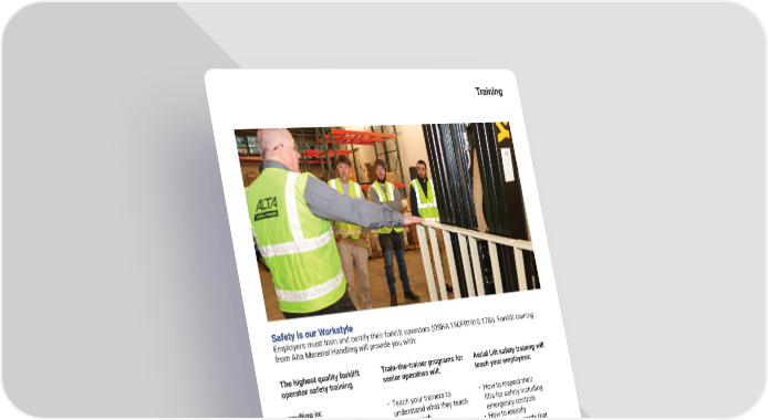 79 mh � altg � com Training Safety is our Workstyle Employers must train and certify their forklift operators (OSHA 19CFR1910 � 178l) � Forklift training from Alta Material Handling will provide you with: The highest quality forklift operator safety training Train-the-trainer programs for senior operators will: Aerial Lift safety training will teach your employees: Our fully trained professional instructors have trained thousands of forklift operators and trainers on all types of lift trucks � We will put together a cost-effective training program tailored to your specific lifts that will help your operators work safely and meet your compliance obligations either in person or online � resulting in: • Increased productivity • Reduced insurance premiums • Lower insurance costs • Teach your trainers to understand what they teach • How to teach • How to document everything to ensure maximum employee benefit and adherence to OSHA and ANSI standards • How to inspect their lifts for safety including emergency controls • How to identify workplace hazards that could cause injury • How to know fall