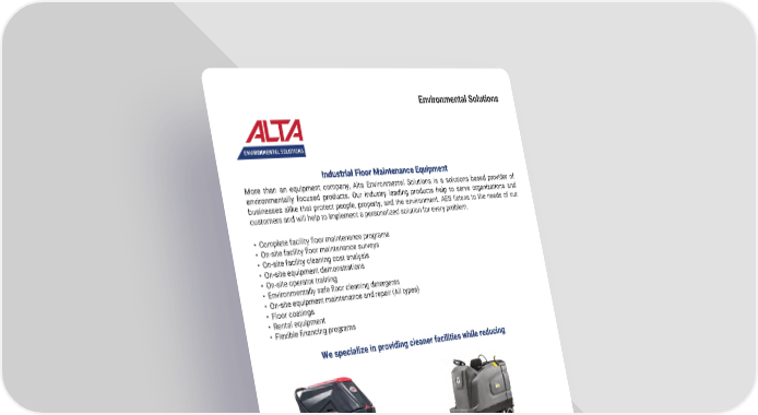59 mh � altg � com Environmental Solutions Industrial Floor Maintenance Equipment More than an equipment company, Alta Environmental Solutions is a solutions based provider of environmentally focused products � Our industry leading products help to serve organizations and businesses alike that protect people, property, and the environment � AES listens to the needs of our customers and will help to implement a personalized solution for every problem � • Complete facility floor maintenance programs • On-site facility floor maintenance surveys • On-site facility cleaning cost analysis • On-site equipment demonstrations • On-site operator training • Environmentally safe floor cleaning detergents • On-site equipment maintenance and repair (All types) • Floor coatings • Rental equipment • Flexible financing programs We specialize in providing cleaner facilities while reducing