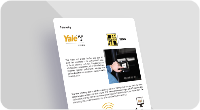 14 mh�altg�com Telemetry Real-time telemetry data on all of your trucks gives you a thorough look into your fleet’s day-to-day operations so your team can work smarter � With our cloud-based service you get 24/7 access to data, notifications, and reports from any device connected to the Internet, including your mobile phone. The telemetry portal can be accessed online or by downloading the mobile app � Yale Vision and Hyster Tracker take your lift truck fleet operations to the next level with state of the art telemetry from Yale � They provide true wireless fleet management, drives fleet efficiency, improves operator performance, reduces your carbon footprint and lowers your overall material handling costs �