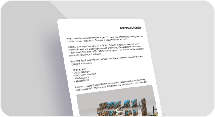 7 mh � altg � com Automation & Robotics Being competitive in today’s market means prioritizing warehouse efficiency while reducing costs and boosting revenue. The solution to this puzzle is simple: warehouse automation. Industrial technologies have advanced to the point that every operation in a warehouse can be improved � From picking and sorting to assembly and cleaning, advanced robotics and automation – when selected and integrated by material handling experts – have driven measurable increases in productivity, efficiency, and profitability. Beyond the clear financial impacts, automation and robotics have proven their ability to enhance operations by increasing: • Order accuracy • Picking throughput • Efficiency and productivity • Warehouse safety • Job satisfaction Automation and robotics can efficiently and accurately complete repetitive, time-consuming, labor-intensive work � This allows your skilled workforce to be re-allocated to value-adding tasks �