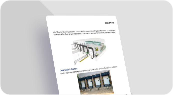 31 mh � altg � com Dock & Door Alta Material Handling offers the nations leading brands of Loading Dock Equipment to complement our material handling service and offers our customers a seamless transition with one vendor for their Commercial Overhead Doors From state of the art high performance roll-up doors to sectional, TKO, and high speed doors, we provide solutions to accommodate all needs � Delivering a high-quality, cost-effective product is our standard and that is why Alta Material Handling has been Dock Seals & Shelters Quality materials and heavy duty construction is featured in all of our dock seals and shelters �