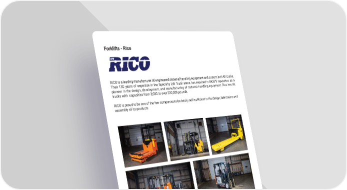 44 mh�altg�com Forklifts - Rico RICO is a leading manufacturer of engineered material handling equipment and custom built lift trucks � Their 130 years of expertise in the Specialty Lift Truck arena has resulted in RICO’S reputation as a pioneer in the design, development, and manufacturing of material handling equipment � Rico has lift trucks with capacities from 3,000 to over 300,000 pounds � RICO is proud to be one of the few companies to be totally self-sufficient in the design, fabrication, and assembly of its products �
