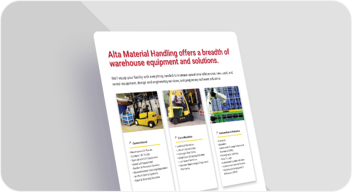 3 mh � altg � com We’ll equip your facility with everything needed to increase operational efficiencies: new, used, and rental equipment, design and engineering services, and proprietary software solutions � Automation & Robotics Electrification Conventional Alta Material Handling offers a breadth of warehouse equipment and solutions. • Warehouse Lift Trucks • Outdoor Lift Trucks • Specialized Lift Equipment • Aerial Lift Equipment • Burden & Personal Carriers • Environmental Cleaning Equipment • In-Plant Safety Systems • Rack & Shelving Systems • Lead Acid Batteries • Lithium-Ion Batteries • Hydrogen Fuel Cells • Solid State Charging Systems • Low Speed Vehicles • Remote Monitoring & Diagnostic Platforms • Conveyor • Sortation • Automated Storage & Retrieval System (AS/RS) • Packaging & Labeling • Pick-To-Light • Automated Guided Vehicles • Autonomous Mobile Robots • Warehouse Management Software (WMS)