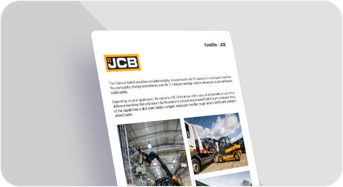 47 mh � altg � com Forklifts - JCB The Teletruk forklift provides unrivaled visibility, forward reach and lift capacity on a compact machine � You can quickly change attachments, and the 111-degree carriage rotation allows you to pick and place loads safely � Depending on your application, the versatile JCB Teletruk can offer many of the benefits of up to four different machines � Not only does it do the work of a conventional masted forklift, but it combines many of the capabilities a skid steer loader, compact telescopic handler, rough terrain forklift and compact wheel loader �
