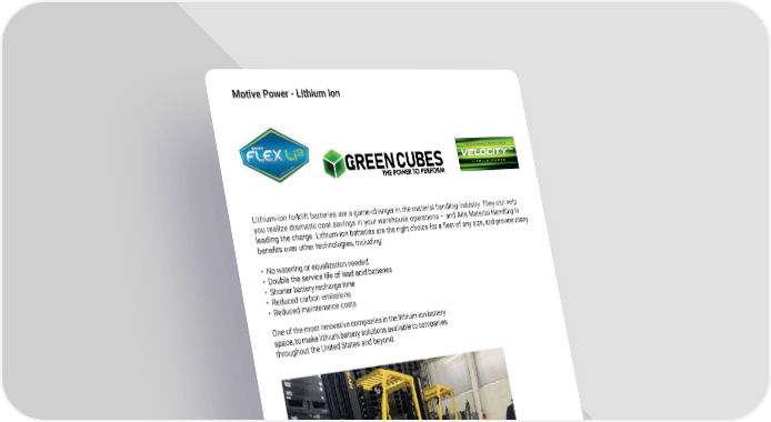 74 mh�altg�com Motive Power - Lithium Ion One of the most innovative companies in the lithium-ion battery space, to make lithium battery solutions available to companies throughout the United States and beyond � Lithium-ion forklift batteries are a game-changer in the material handling industry � They can help you realize dramatic cost savings in your warehouse operations – and Alta Material Handling is leading the charge. Lithium-ion batteries are the right choice for a fleet of any size, and provide many benefits over other technologies, including: • No watering or equalization needed • Double the service life of lead acid batteries • Shorter battery recharge time • Reduced carbon emissions • Reduced maintenance costs