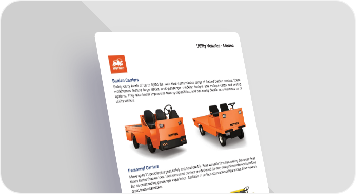 63 mh � altg � com Utility Vehicles - Motrec Burden Carriers Safely carry loads of up to 5,000 lbs. with their customizable range of flatbed burden carriers. These workhorses feature large decks, multi-passenger modular designs and multiple cargo and seating options � They also boast impressive towing capabilities, and can easily double as a maintenance or utility vehicle � Personnel Carriers Move up to 11 people plus gear, safely and comfortably � Save valuable time by covering distances three times faster than on foot � Their personnel carriers are designed for easy navigation and smooth braking for an outstanding passenger experience. Available in various sizes and configurations. Also makes a great tram alternative �