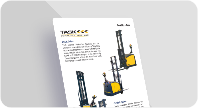 51 mh � altg � com Forklifts - Task Boa & Cobra Task Legless Pedestrian Stackers are the ultimate in accessibility and efficiency. They don’t require clearance beams or space between pallet loads, virtually eliminating product damage � The BOA® and COBRA® are part of the ‘Brilliant by Design’ range that utilizes the latest Laser Lock technology to create precision builds � Conda & Python Task’s Pedestrian Straddle Stackers will help make your storage and dispatch a very smooth process � Highly stable and very maneuverable, the CONDA® and PYTHON® have set new heights in materials handling � They come with the ‘Brilliant By Design’ lifetime chassis warranty �