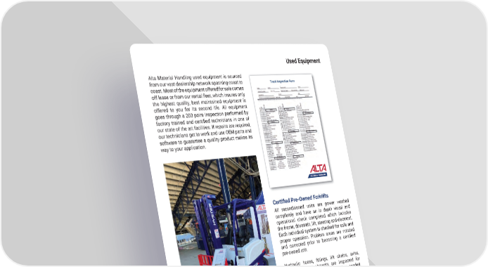 77 mh � altg � com Used Equipment Alta Material Handling used equipment is sourced from our vast dealership network spanning coast to coast � Most of the equipment offered for sale comes off lease or from our rental fleet, which insures only the highest quality, best maintained equipment is offered to you for its second life � All equipment goes through a 200 point inspection performed by factory trained and certified technicians in one of our state of the art facilities � If repairs are required, our technicians get to work and use OEM parts and software to guarantee a quality product makes its way to your application � Truck Inspection Form Certified Pre-Owned Forklifts All reconditioned units are power washed completely and have an in depth visual and operational check completed which includes the frame, drivetrain, lift, steering and electrical � Each individual system is checked for safe and proper operation � Problem areas are notated and corrected prior to becoming a certified pre-owned unit � Hydraulic hoses, fittings, lift chains, axles, brakes, and attachments are inspected for wear or damage and are replaced as needed � Any lights, horns, or backup alarms are verified for proper operation and replaced as needed � Frames and welds are inspected for cracks or misalignment. All fluids are changed, and the unit is checked for leaks � Engine compression is checked for proper readings per OEM Service Manual and any issues with the engine are addressed as needed (LP units only) � Tires and seats are replaced with new parts and each unit receives a full paint job � All parts used are Hyster or Yale OEM parts installed by factory trained and certified technicians.